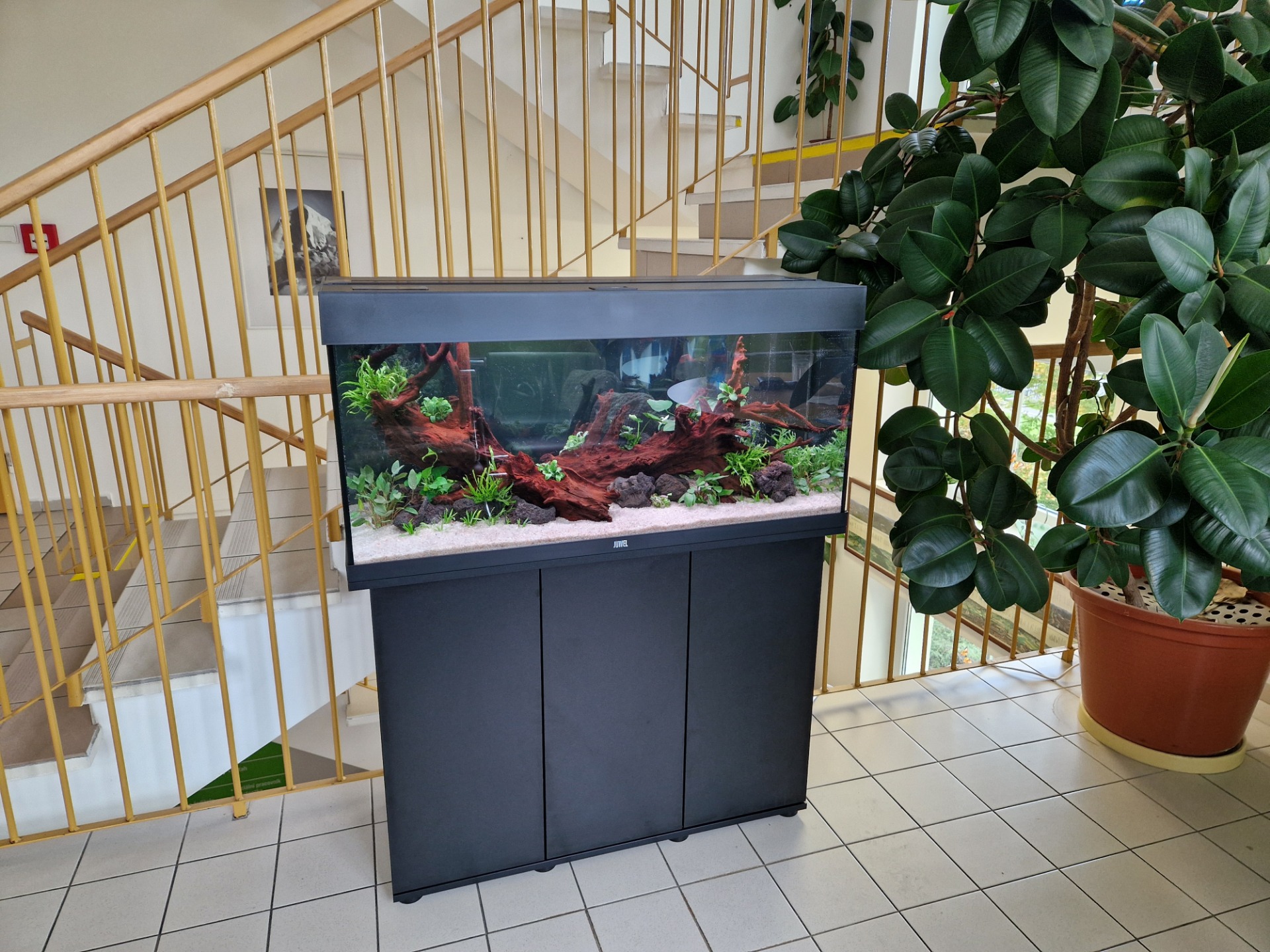 Juwel RIO 180 s originálním vnitřním filtrem, ve kterém jsou originální houby nahrazené pemzou v síťkách. Je zde dodržována pravidelná týdenní údržba, která obsahuje odkalení dna, výměna 50% vody a očištění skel, čištění filtru probíhá jednou za 14 dní. Jsou zde nakombinované náročné, nenáročné, pomalu, ale i rychle rostoucí rostliny. Dávkování...